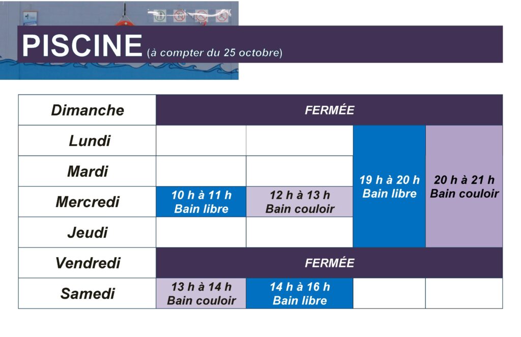 Veuillez prendre note que l’horaire de la piscine peut être sujet à changements.